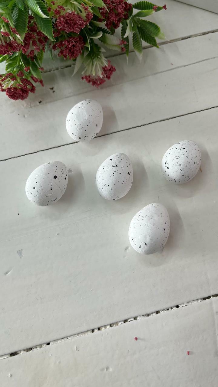 Detalhes do Produto: - Contém 5 unidades de ovinhos brancos com pintinhas; - Tamanho compacto, perfeito para composições detalhadas; - Imagens ilustrativas: decoração não acompanha, somente os ovinhos.
