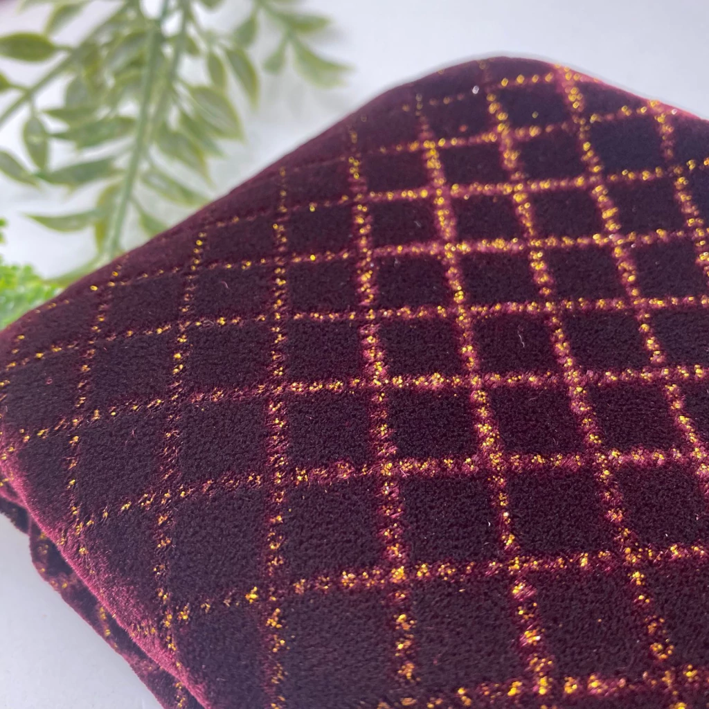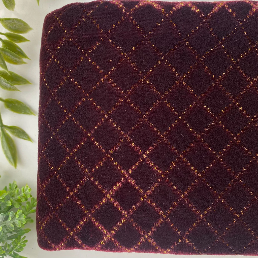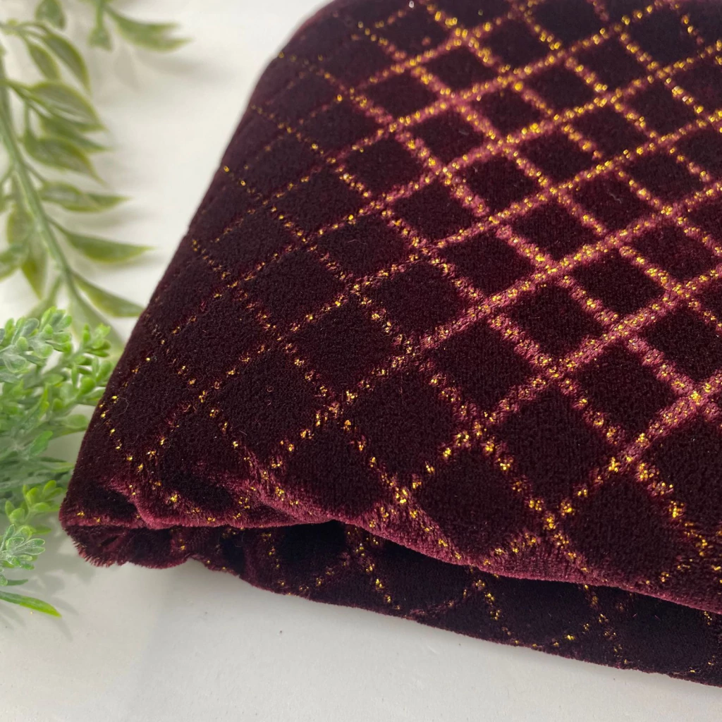 Tecido em veludo vermelho intenso, com delicada estampa de losangos pontilhados. Perfeito para roupas de bonecas, detalhes em bichinhos de pano e criações natalinas. Toque macio, brilho sutil e acabamento encantador.
